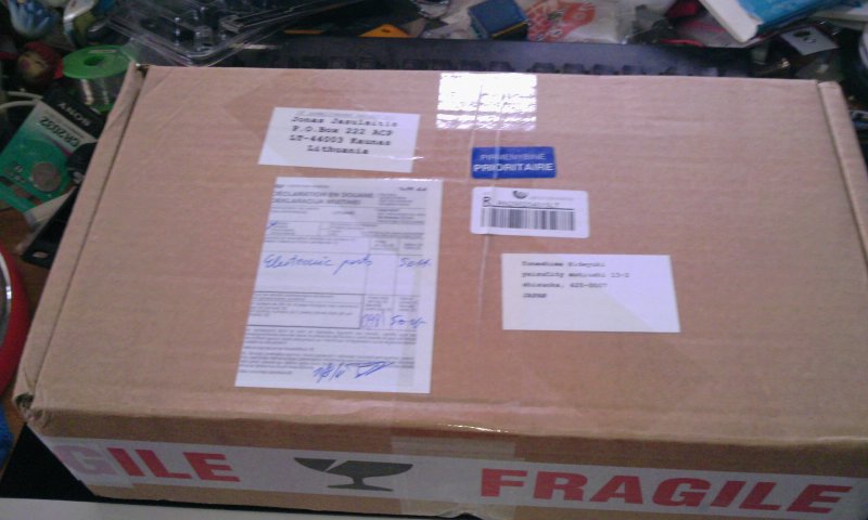 箱はこんな感じ、左上のシールにLithuania(リトアニア)って記述されてる。結構カッコイイぜ。FRAGILEって割れ物注意かな?マークがガラスコップが割れてるマークなのでそんなニュアンスだと思う