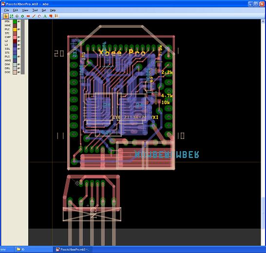 こんなの。実装面上ではPsoc(CY8C21534-24PVXI。秋月で280円という安い価格))と5Vと3.3v間をレベルシフト用の回路と搭載。表面は電源用に5VとXbee用3.3Vの三端子レギュレータを載せてみた。もしMBE形式でもパターン図ほしい方は言ってください。そのうち期間限定でうpします。