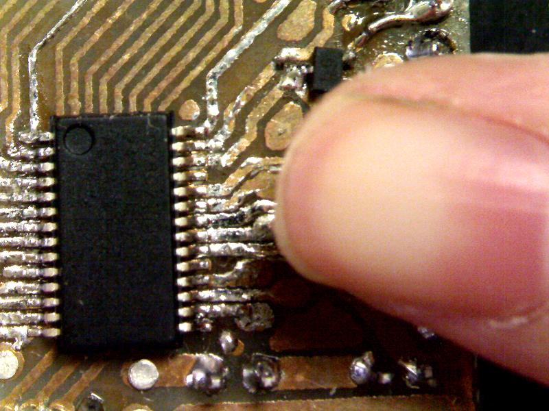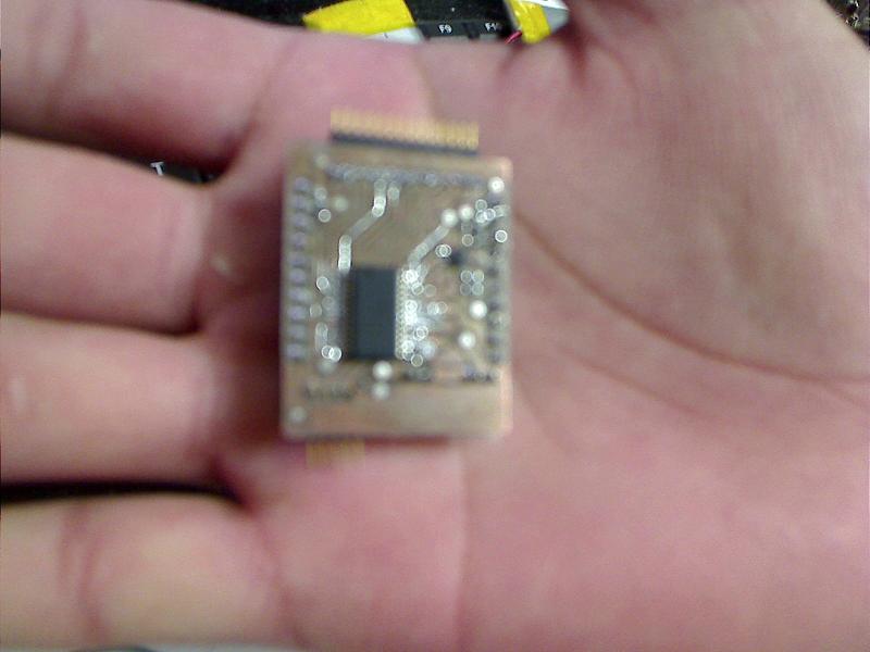ちなみにこれがPsocのチップ。写っている指は小指です。小指に乗るくらい小さいやつです。これでUARTとモータ二個のPWM制御させる事ができます。